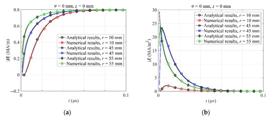 The exemplary calculations were performed for the radii of the inner a, middle b, and outer c parts of the three-layer cylindrical object equal to 30, 50, and 70 mm, respectively. The exemplary electrical conductivities σa, σb, and σc were set to 8, 17, and 10 S/m, respectively and the relative magnetic permeability μr = 1 (μ = μ0μr). In the unit step function, the magnetic field H1 value was set to 7.95 × 105 A/m. The calculated absolute values of the magnetic field intensity H and the induced eddy current density vectors J are shown in Figure 3 on the left and right, respectively.