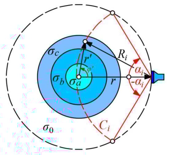 Figure 4 shows the conceptual framework of the MAT-MI forward problem for the determination of the acoustic pressure at the transducer location. The ultrasound transducer scans the object around a circle, and both the object and the transducer are immersed in pure water (σ0 ≈ 0) for better ultrasound coupling. Here, the given layers of the three-layer cylindrical object under consideration represent the adjacent acoustic pressure sources. For each transmission time ti, the detected pressure was the sum of all the sources on each detection arc Ci with the transmission distance Ri, which can be considered as one analogous source on the normal direction of the ultrasonic probe. For the calculation approach, Ci are arcs on which the integration will be performed, according to (10), to determine the acoustic pressure at the point of the transducer location for each transmission time ti, in the interval [−αi, αi]. The length of the Ci arcs are in the range from 0 (at the point of the transducer location) to π r / 2 (where Ri is equal to 2 r ) and back to 0 (Ri is equal to 2r), which corresponds to the consecutive angles 2αi between 180 and 0 degrees.