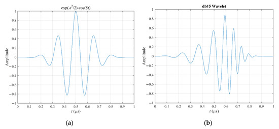 To obtain real shape collected waveforms, it is important to correctly choose the impulse response R(t) shape of the transducer. In MAT-MI measurements such a data is usually provided by the transducer’s manufacturer. However, for our calculations we adopted several mother wavelets which faithfully reproduce the actual shape of the impulse response of typical ultrasonic transducers (e.g., PBP Optel Sp. z o. o.—center frequency of 0.5 MHz, diameter 25 mm, material polyacetal). Among them we chose the Morlet and Daubechies (db15) wavelets, which shapes are shown in Figure 5, on the left and right, respectively. During performing the reconstructing the image with these wavelets we did not notice significant changes in the obtained images’ quality and therefore we decided to use the Morlet wavelet for further calculations.