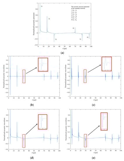 In Figure 6b–e, the acoustic waveforms normalized by their maximum amplitude, obtained after convolution between the calculated acoustic pressure and the system transfer functions shown in Figure 5a,b for two different the centre frequencies are presented. For these figures, the six wave clusters are clearly displayed and correspond to the actual location of the six acoustic pressure peaks illustrated in Figure 6a. The amplitudes and vibration polarities of these wave clusters are generated by the corresponding vertical pressure jumps, reflecting the polarities and values of the conductivity changes between the regions with different conductivities. For example, the two opposite cluster vibration polarities located at 30 and 70 μs with a time interval of 40 μs define the boundaries of the III region (the region with σa) of the inner part of the object.