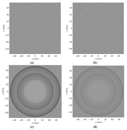 Based on the back-projection algorithm of Equation (5), the acoustic source reconstruction as a Lorentz force divergence distribution of the traditional MAT-MI image was reconstructed as illustrated in Figure 7a–d with the 360 calculated waveforms collected around the object. Three coaxial rings with the radii of 70, 50, and 30 mm are displayed, which are consistent with the cross-sectional conductivity distribution in Figure 2 and Figure 4 in terms of shape and size. The boundary colours of the outer and middle mediums are different than that of the inner medium due to the polarity of the pressure peaks visualized in Figure 6a.