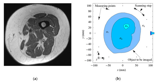 Figure 8b shows the considered 2D planar geometry that was built based on the magnetic resonance imaging (MRI) image of the human thigh presented in the Figure 8a [31]. The three-layer conducting object to be imaged is placed non-concentrically in the non-conductive environment (σ0 = 0), under the action of two external static and time-varying magnetic fields. In calculations, the amplitude of the static magnetic field with the flux density B0 was set to 1 T, and, in the unit step function, the pulsed magnetic field with the flux density B1(t) value was set to 1 T. The electrical conductivities of the inner, middle, and outer layer of the object (equivalents of the human femur, muscle, and fat) were set to σa = 5.73 × 10−2 S/m, σb = 4.35 × 10−1 S/m, and σc = 3.50 × 10−3 S/m, respectively [32]. The relative magnetic permeability value μr was set to 1 and this is the same for each object’s layer. We assumed that the layers were acoustically homogeneous without any reflections, dispersion, or attenuation, which indicates that the studies were ideal (recorded signals were considered as a noise-free). The acoustic velocity cs was set to 1500 m/s. The measuring points (real transducers’ equivalent) were placed on the circumference of the virtual circle with a radius equal to 100 mm. In Figure 8c–h, we present the results of the reconstructing the object for different numbers of measuring points.