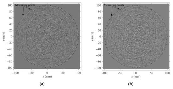 According to the given formulas and the results of the eddy current distribution obtained in the previous section in the whole volume of the chosen object, the acoustic pressure and corresponding acoustic waveforms at the point of the transducer were computed. For simplicity, the acoustic environment was considered to be acoustically homogenous without any reflections, dispersion, or attenuation, which makes the studies ideal. In calculating the measuring points, transducer equivalents were used. The measuring points were placed on the circumference of the virtual circle with an angle step (scanning step) of 1°. The velocity of sound was set to 1500 m/s for the object and environment. The calculation grid was set to 0.05 mm, and the sampling frequency was set to 100 MHz. As shown in Figure 2b, the distribution of the acoustic pressure determined at (75, 0) mm is presented in Figure 6a, which is normalized by the maximum pressure.