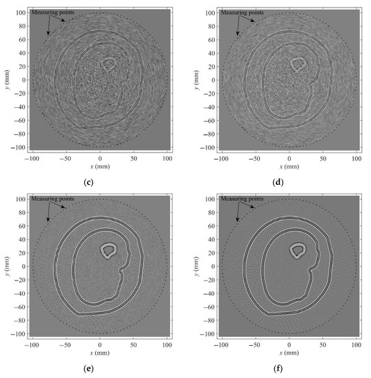 The subjective assessment is undoubtedly pointing at more measuring points leading to a better-quality image with less time-reversal noise. We observed that, in the case of 12 measuring points (30° scanning step), limited information regarding the layers of the object is revealed (Figure 8c). For 24 measuring points (15° scanning step), some features of the object (boundaries) begin to emerge; however, blurring artifacts inside and outside the object can be observed. With the 6° scanning step (Figure 8f), the reproduced ultrasonic source locations almost perfectly correspond to the real positions of the objects. Significant image reconstruction improvement occurs when the scanning step is around 4° (90 measuring points). Further decrements of the scanning step did not greatly change the image.
