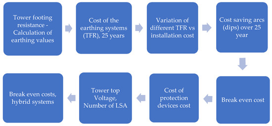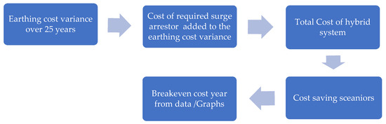 Figure 2 describes the process followed to determine the type of hybrid system and the breakeven cost. This process can be followed to determine the cost to achieve earthing profiles of various values, the cost-saving resulting from dip prevention, the power surge magnitude on the conductor in the phase, and the number of surge arresters needed for draining the power surge into the ground. The breakeven cost is also determined.
