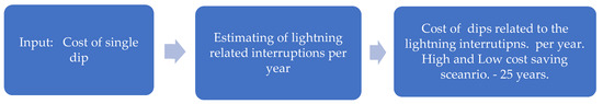 Figure 4 shows the process used to calculate the cost related to dips over 25 years. Dips arise when line breakers arcs. This can occur due to lightning strokes. The resultant consumer outage is associated with a cost. Depending on the number of lightning strokes and dips, an annual cost loss (or saving if dip can be prevented) can be calculated over 25 years.