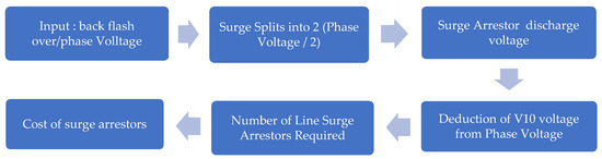 The over-voltage surge caused by the lightning stroke may result in a back flashover. Figure 7 illustrates the process required to calculate the required number of surge arrestor. This is a simple process of deduction the overvoltage on the phase conductor (remember that this splits into two) by the V10 (discharge voltage) until the power surge is completely eliminated.