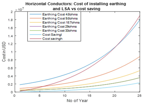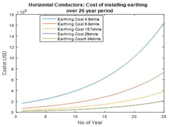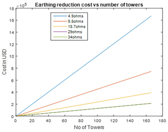 There is the only instance when a back flashover will not occur with a uniform and low earthing profile. This is when the earthing profile is 4.9 Ω, and the lightning stroke is 12.5 kA. All other scenarios will result in a back flashover. The cost involved in obtaining an earthing system that varies between 4.9 Ω and 34 Ω is substantial, as illustrated in Figure 9. Furthermore, it is almost impractical to install a vast amount of conductors to achieve low earthing values.