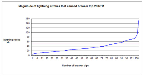 The number of disturbances over four years is shown in Figure 11 [2,14]. These interruptions were all triggered by flashing strikes within 1 km of line diameter. The corresponding strokes were obtained from the FALLS method for the interruption period [14]. Data analysis showed 106 breaker interruptions triggered by lightning during a four-cycle storm period. The lightning strokes were less than 50 kA and contributed to 83 of these interruptions. This is all about 78% of breaks. That is 21 per year on average.