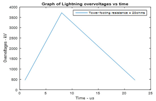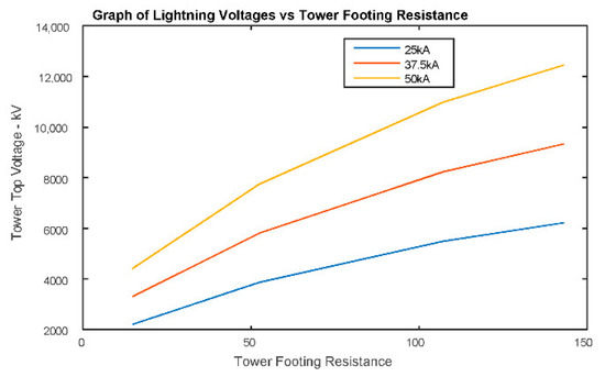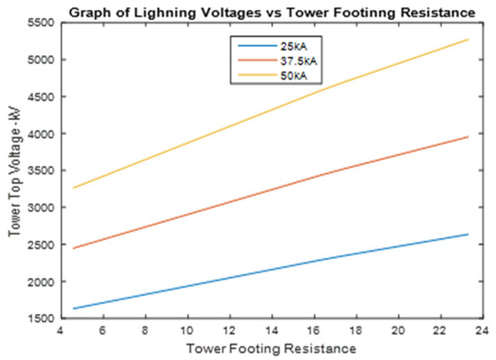 The tower voltage will increase with an increasing tower footing resistance by a constant lightning-stroke magnitude. For the earthing values used, no earth improvement techniques were considered. As discussed in Section 3, utilizing earthing enhancement techniques, which reduces the tower footing resistance value below 30 Ω, the graphs shown in Figure 16 are obtained.