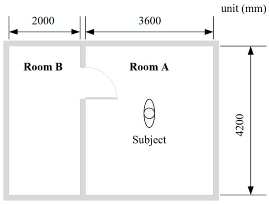 The lab experiments were conducted in a test chamber at Tongji University, Shanghai, China [40], to measure older people’s local skin temperatures under thermal transient conditions. The test chamber consists of two adjacent rooms (room A and room B), as shown in Figure 1. The thermal environment in the two rooms can be controlled by air-conditioning systems.