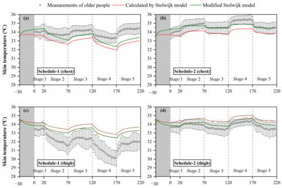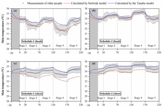 Figure 6 shows the comparisons of thermal sensation predicted by local skin temperatures obtained from experiments and human thermoregulation models. Significant discrepancies in the calculated thermal sensation were observed in all experiments. For schedule 1, the largest deviation between thermal sensation predicted based on measured skin temperatures and the Tanabe model’s calculated results was 3.0 units in stage 5. Smaller discrepancies in thermal sensation were observed for the Stolwijk model, with an RMSE of 0.5 units. For schedule 2, the RMSE values between the thermal sensation predicted based on measured skin temperatures and calculated results of the Stolwijk model and the Tanabe model were 0.9 and 0.8 units, respectively. The largest variation for the Stolwijk model was 2.0 units in stage 2, and 1.7 units in stage 5 for the Tanabe model. The results show that the inaccurate prediction of older people’s local skin temperatures would lead to mistakes in evaluating thermal sensation.