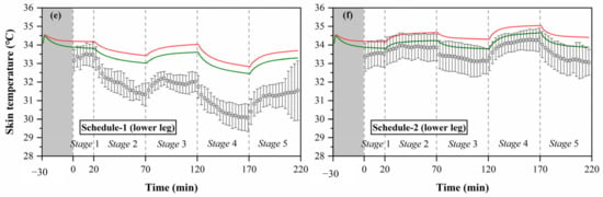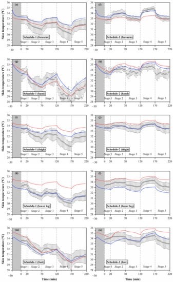 The black boxes in Figure 5 show the older people’s thermal responses of local skin temperature under transient conditions for all segments. These typical tendencies of the thermal responses for local skin temperature were observed at all segments. However, the fluctuations of local skin temperatures under cold or hot exposures varied with segments. In schedule 1, the largest fluctuation of local skin temperature was found at the hand, ranging from 28.2 °C to 33.8 °C, while the smallest fluctuation was the chest temperature, ranging from 33.3 °C to 34.4 °C. In schedule 2, the largest fluctuation of local skin temperature was found at the forearm, ranging from 32.7 °C to 34.8 °C, while the smallest fluctuation was the thigh temperature, ranging from 33.3 °C to 34.4 °C.