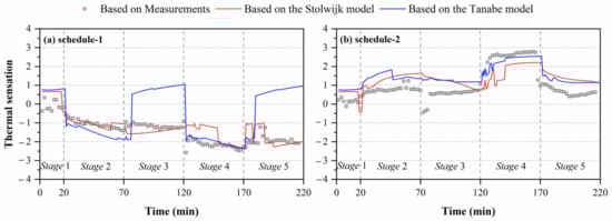 Comparisons of predicted thermal sensation based on local skin temperatures measured by experiments and calculated by the Stolwijk model and Tanabe model, (a) schedule 1, (b) schedule 2.