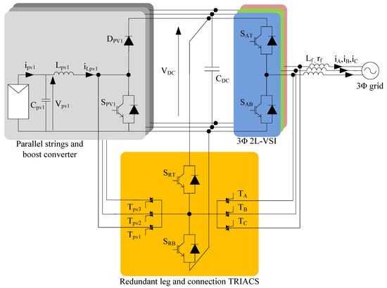 Figure 1 shows the considered fault-tolerant PV multistring inverter. It consists of two stages. The first stage is constituted by three DC-DC boost converters that are connected to the PV strings and the second stage consists of a two-level three-phase DC-AC converter that is connected to the grid. The fault-tolerant part consists of a single redundant switching leg (, , and its corresponding anti-parallel diodes) and six bidirectional triode thyristors (TRIACs, , , , , , and ) that connect the output of the redundant leg to the output of the DC-DC and DC-AC stages switching legs.