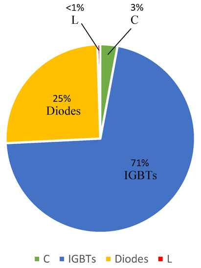 Figure 2 shows the relative contribution from each component to the multistring-inverter failure rate, calculated according to Table 1 and Appendix A. It can be noticed that the IGBTs and diodes are the most critical elements in terms of reliability. Therefore, the introduction of a redundant switching leg would be beneficial.