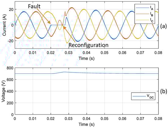 In a first simulation, an open-circuit fault is simulated on switch at time . After the detection and localization of the faulty switch, the system is reconfigured by enabling TRIAC and redirecting phase A switching signals to the redundant switching leg, as it can be seen in the grid currents that are shown in Figure 4a. Normal operation is achieved after a few ms transient. Figure 4b allows verifying that the DC bus voltage is affected within reasonable limits and its control is kept during the fault detection and reconfiguration interval.