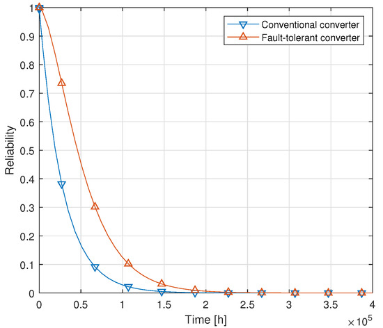 Reliability functions of the proposed fault-tolerant converter and the conventional non-fault-tolerant converter.