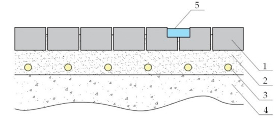 Cross section of the heating system: 1—outside surface, 2—sand and cement, 3—heating pipes, 4—hardened ground, 5—temperature and humidity sensor.