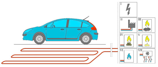 Schematic diagram of parking lot heating with: I—electricity, II—district heating network, III—hard coal boiler, IV—biomass boiler, V—fuel oil boiler, VI—condensing gas boiler, VII—heat pump with ground heat exchanger.