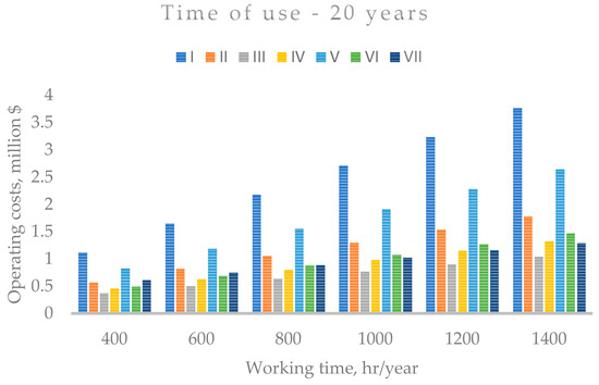 Chart of the operating costs of individual heating systems for an operating time of 400 to 1400 h over 20 years of use, where: I—electric heating power supply, II—liquid heating supplied from the district heating network, III—liquid heating powered by a hard coal boiler, IV—liquid heating powered by a biomass boiler, V—liquid heating with fuel oil boiler, VI—liquid heating powered by a natural gas boiler, VII—liquid heating powered by a ground source heat pump.