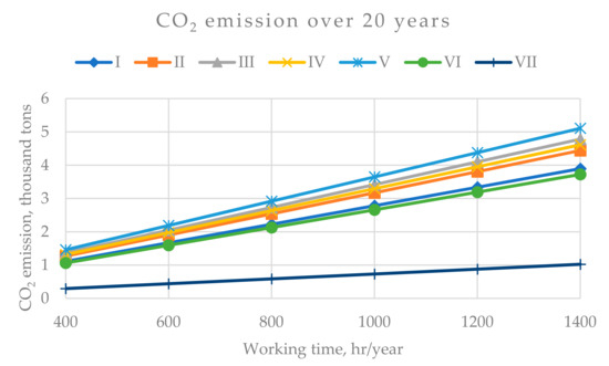 CO2 emissions of individual heating systems for an operating time of 400 to 1400 h over a 20-year period, where: I—electric heating power supply, II—liquid heating supplied from the district heating network, III—liquid heating powered by a hard coal boiler, IV—liquid heating powered by a biomass boiler, V—liquid heating with fuel oil boiler, VI—liquid heating powered by a natural gas boiler, VII—liquid heating powered by a ground source heat pump.