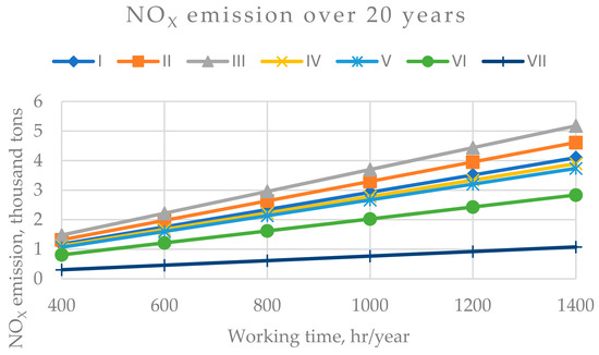 NOX emission of individual heating systems for an operating time of 400 to 1400 h over 20 years of use, where: I—electric heating power supply, II—liquid heating supplied from the district heating network, III—liquid heating powered by a hard coal boiler, IV—liquid heating powered by a biomass boiler, V—liquid heating with fuel oil boiler, VI—liquid heating powered by a natural gas boiler, VII—liquid heating powered by a ground source heat pump.