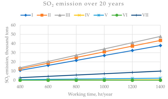 Figure 6 shows the graph of SO2 emission of individual heating systems for the system operation time from 400 to 1400 h during 20 years of use. Sulphur compounds are emitted during the combustion of solid fuels as well as heating oil. The emissions depend, among other things, on the quality of the fuel used. The highest values can be observed in liquid heating systems powered by a hard coal boiler (III), electric heating systems (I) and liquid heating systems powered by system heat from the heating network (II). The liquid heating systems powered by a natural gas boiler (VI), biomass (IV) and fuel oil (V) are characterized by the lowest and almost zero emission of SO2 among other heating systems, which results directly from the fuel used [37,40].