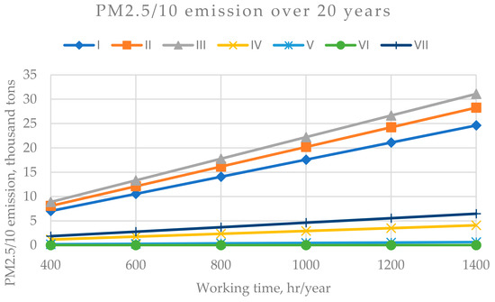 Figure 7 shows a graph of PM2.5 and PM10 dust emissions from individual heating systems with operating times from 400 to 1400 h over 20 years of use. The highest dust emission values can be observed in liquid heating systems powered by a hard coal (III) boiler, which results from the lack of dedusting devices in this type of installations. Dust emission in the electric heating (I) and district heating (II) installations is also high. As in the case of other pollutants, it results from the use of fossil fuels in the energy production process in Poland [35,36]. In other systems, it is several dozen times lower. The lowest dust emission occurs in liquid heating systems powered by a natural gas (VI) and fuel oil (V) boiler, which results directly from the characteristics of fuel.