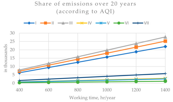 Global emission of the analyzed pollutants, taking into account the AQI shares for individual heating systems, for the installation operation time of 400 to 1400 h over 20 years of use, where: I—electric heating power supply, II—liquid heating supplied from the district heating network, III—liquid heating powered by a hard coal boiler, IV—liquid heating powered by a biomass boiler, V—liquid heating with fuel oil boiler, VI—liquid heating powered by a natural gas boiler, VII—liquid heating powered by a ground source heat pump.