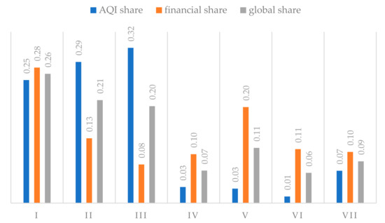 The AQI share, financial share of individual installations and the total impact of both factors as a global share for the installation operating time of 1000 h over 20 years of use, where: I—electric heating power supply, II—liquid heating supplied from the district heating network, III—liquid heating powered by a hard coal boiler, IV—liquid heating powered by a biomass boiler, V—liquid heating with fuel oil boiler, VI—liquid heating powered by a natural gas boiler, VII—liquid heating powered by a ground source heat pump.