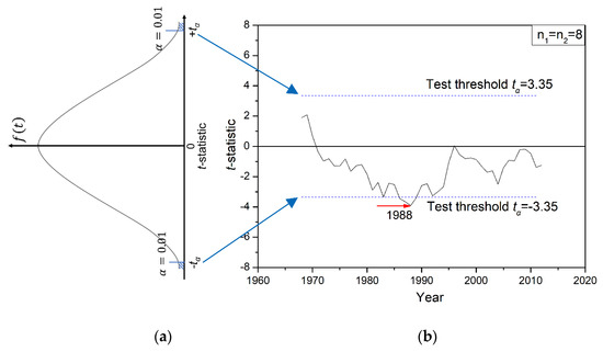 The Moving t-test method is to identify the significant difference between two data sequences to define an abrupt climate change [55]. It includes the following steps.