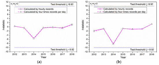 The daily meteorological records from 1960 to 2019 used in this study are provided by the National Meteorological Information Center of China (CMDC, http://data.cma.cn/en). All weather stations in China were only collected four times a day (00:00, 06:00, 12:00, 18:00) before 2010, and hourly records have been captured since 2010. Due to the different frequencies of the meteorological records captured in the different periods, the daily meteorological records released in China today are still only four times a day. Regarding the quality of meteorological records, this paper takes the mean dry-bulb temperature records of Beijing from 2010 to 2019 as an example. Figure 2a,b show the different outcomes of the abrupt climate analysis between monthly and annual average values based on two different records (four times a day and hourly). It is demonstrated from Figure 2 that the ACC analysis results calculated with the hourly or four times records are actually the same. Therefore, it can be addressed that the analysis outcomes of abrupt change points with monthly and annual average data based on daily records captured hourly and only four times per day are also very consistent.