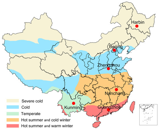 As mentioned earlier, this study selected six cities from different climate zones in China as examples. Five different climate zones in China shown in Figure 3 were defined for building thermal design and indoor environment simulation, namely severe cold, cold, hot summer and cold winter, hot summer and warm winter, and temperate [52]. One city was selected within each of these climate zones in China in this study, namely Harbin (severe cold, 45°45′ N/126°46′ E), Zhengzhou (cold, 34°43′ N/113°39′ E), Nanchang (hot summer and cold winter, 28°40′ N/115°58′ E), Guangzhou (hot summer and warm winter, 23°08′ N/113°19′ E), and Kunming (temperate, 25°01′ N/102°41′ E), as shown in Figure 3. In addition, this study also analyzed the capital of China, Beijing (cold, 39°48′ N/116°28′ E). All meteorological parameters of a TMY were tested/examined with MTT method. The results are shown in Figure 4.