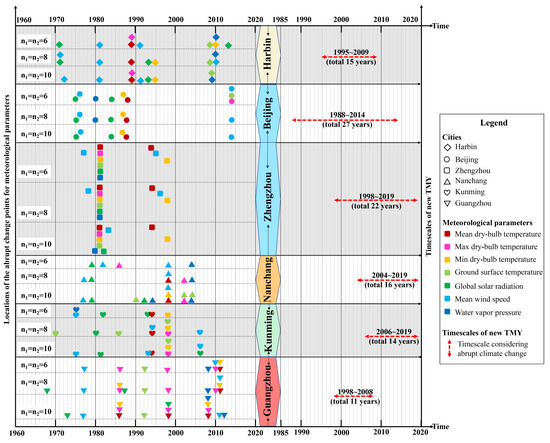 It is identified in Figure 5 that the abrupted climate changes happened concentratively in some years in some selected cities, such as Harbin within 1989–1995 and 2008–2010, Beijing within 1975–1988, Zhengzhou within 1978–1983, Nanchang within 1998–2004, Kunming within 1993–1998, Guangzhou within 1986–1998 and 2008–2012. Additionally, it also shows that the abrupt climate change in Zhengzhou occurred most concentratively in 1981. Therefore, the stable climate states with different periods were shaped before and after each abrupt climate change point, as shown in Figure 4. According to the timescale selection principles described previously, the new timescales for Harbin, Beijing, Zhengzhou, Nanchang, Kunming, and Guangzhou considering the impact of ACC are eventually defined as 1995–2009 (total 15 years), 1988–2014 (total 27 years), 1998–2019 (total 22 years), 2004–2019 (total 16 years), 2006–2019 (total 14 years), 1998–2008 (total 11 years), respectively.