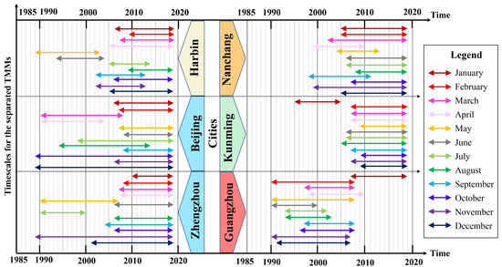 Based the timescale selection principles in Section 3.1, the possible abrupt change points between 1960 and 2019 were analyzed based on the individual monthly average data of the sample cities. The results shown in Figure 5 demonstrate that the new timescales with the consideration of ACC based on the monthly average data were mostly within 2005–2019 for Harbin, Beijing, Zhengzhou, Nanchang, and Kunming, while Guangzhou was within 1990–2010.