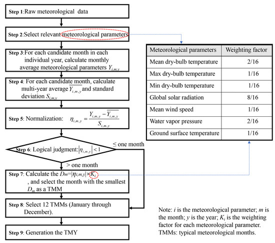 With the economic development in China since 1980s, most cities have recorded meteorological data for more than 30 years. According to the characteristics of meteorological records obtained in China, the CSWD method was released in 2005 [10,11,12]. This CSWD method is referred in all relevant building energy efficiency standards and guidance in China today [52]. It is also applied in this study. The CSWD method includes nine steps shown in Figure 6. According to this method, the meteorological parameters include mean, max and min dry-bulb temperatures, water vapor pressures, global solar radiations, ground surface temperatures, and mean wind speeds. If all of the above meteorological parameters meet the logical judgment condition (∣ηi,m,y∣ < 1) in the step 6 in Figure 6, this month can be considered as a TMM. If a parameter does not meet the logic judgment condition, it needs to go to Step 7 to select the month with the smallest Dm as a TMM. When 12 TMMs from January to December are determined, the TMY can be developed.
