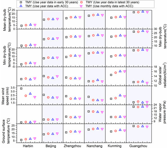 Based on the new timescale obtained from the above analysis, the TMY data of six selected cities was updated (Table 1). The results in the Table 1 demonstrate most TMMs of each city with the ACC consideration (in each city, Row 1 is based on the year datasets; Row 3 is based on monthly datasets) and without the ACC consideration (Row 2 is based on latest 30 years datasets; Row 4 is based on early 30 years datasets) are mostly different. Only a small part of both TMMs (in bold font) with the ACC consideration are same as the latest 30 years of TMMs. There is no same TMM at all between the TMMs with ACC consideration and the TMMs between 1971 and 2003, which are still used by the current Chinese standards. This indicates that it is necessary to consider the ACC in the TMY development.