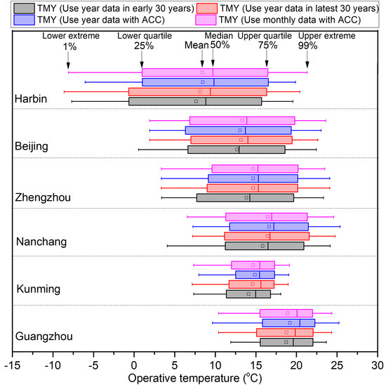 It is revealed in Figure 10 that the impact of ACC on the adaptive operative temperatures in the six sample cities in different climate zones in China are various. The impacts are much less in Zhengzhou, but greater in Guangzhou. The results show an overall 0.15–0.42 °C difference in the thermal comfort analysis within different cities.