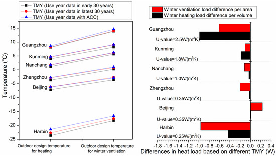 Since the meteorological data obtained in this study are daily data, it is not suitable to the calculation of outdoor design temperatures in summer due to the above conditions. Hence, this is not covered here. The results of the outdoor design temperature calculation for heating and winter ventilation under the influence of ACC in the six cities in China are shown in Figure 11. It reveals that the influences of ACC on outdoor design temperature analysis are different in different cities. Harbin had a more severe impact than others. With the influence of ACC, the outdoor design temperature for heating increased from 0.1 to 1.3 °C, and the outdoor design temperature for ventilation increased from 0.1 to 1 °C. This indicates that the increase of outdoor design temperatures may have an impact on building design heating loads. According to the calculation formulas from the China’s energy-saving design standards (Formulas (3) and (4)), the thermal performance analysis for a standard building based on the new TMY shows that the heating reduces between 0.1 and 1 W/m2, and the energy for ventilation reduces between −0.3 and 1 W/m3. These impacts in Guangzhou and Harbin are more significant than other cities.