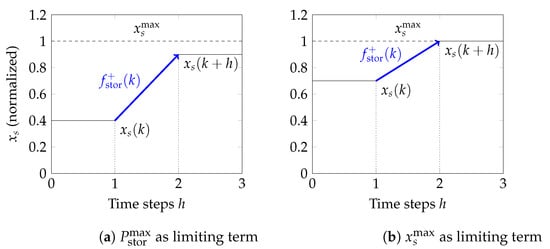 where h is the discretization step size, and , , , and are the SoC limits and storage power limits, respectively. Storage flexibility is defined as the margin between the current storage power and the upper and lower bounds, respectively, constrained by the SoC limits on . As indicated in Figure 1, increased-demand storage flexibility () is the maximum amount of power with which can be increased for one time step width h, such that both the maximum storage power injection constraint (Figure 1a) and the storage energy limit (Figure 1b) are still satisfied.
