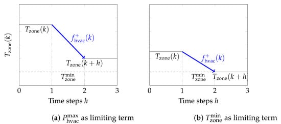 where and represent the thermal comfort level limits at time k. Positive HVAC flexibility is visualized in Figure 2, showing that the limiting term is either the HVAC power (Figure 2a) or the thermal comfort level (Figure 2b).