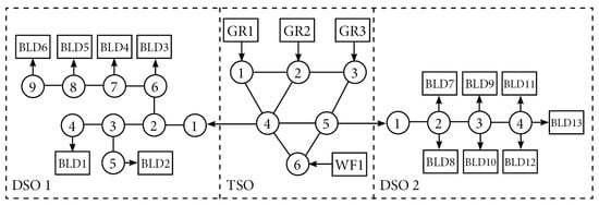 with state variable , and appropriate matrices , , and . For the full derivation of the system parameters for a similar model without wind-power integration, the reader is referred to [17,21,25]. The element of vector for bus k is defined as . and represent the power demand and flexibility from all DSO networks connected to the TSO, respectively, and are obtained as follows: