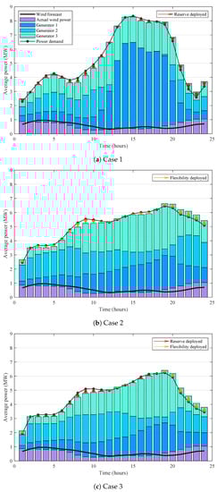 The power balance in the TSO network for all cases is presented in Figure 4, showing a reduced production for Case 2 and 3, compared to Case 1. In particular, Case 2 yields a total reduction in conventional generation of 2.7% compared to Case 1, whereas for Case 3, this reduction is 12.8%. The solid black line shows the forecast wind power, and the dark green bars show the actual wind power. As shown in both Figure 4 and Figure 6, between 3:00–11:00 and 15:00–17:00, the wind-power error is negative, , and from 12:00–14:00 and 18:00–24:00, the error is positive, . To restore the power balance, when , Case 2 employs the decreased-demand flexibility and on the contrary, Case 1 uses the up-spinning reserve power to reduce output power dispatch. Similarly, when , Case 2 employs the increased-demand flexibility and on the contrary, Case 1 uses the down-spinning reserve power to reduce output power dispatch.