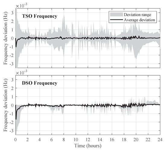 Figure 5 depicts the frequency deviations in the TSO and DSO networks for Case 3. Frequency deviations for all the cases are kept well below allowable limits. Enabling building-side flexibility results in a reduction of 5.3% in cumulative squared frequency deviation for the total network, and a reduction of 32.5% in the DSO network only.