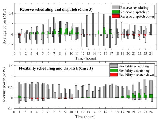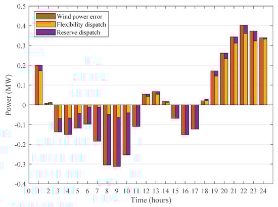 The wind-power error together with the reserve and flexibility dispatch for Case 3 is presented in Figure 6. As reserve and flexibility are valued at the same cost in the objective function, the distribution between the two indicates that both mechanisms are cooperating well to meet the power balance. The total flexibility dispatch accounts for 44.37% of the total compensation for the wind-power error over the 24h simulation time. It is shown that in the case of a positive wind-power error, flexibility dispatch is promoted over reserve, while for a negative wind-power error, the opposite is observed. Finally, Figure 6 also shows that the wind-power error is perfectly compensated throughout the full day, by the sum of flexibility and reserve deployment.