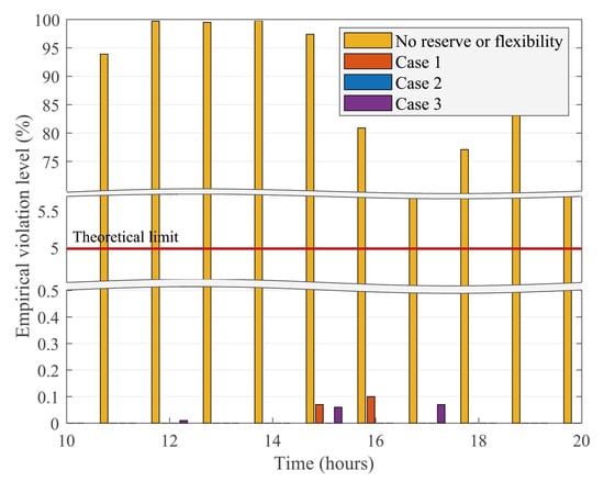 The results of our Monte Carlo simulation to determine the empirical constraint violation level are presented in Figure 8 for all 3 cases along with a case in which no reserve or flexibility is used. As the majority of violations are observed during peak load hours, only this portion of the simulation horizon is presented. For the case with no reserve or flexibility, empirical violation levels are extremely high, as any deviation of the wind power from the forecast trajectory almost exclusively results in violation of the power line limits. For Case 1 and 3, maximum empirical violation levels are around 0.1%, whereas for Case 2, no violations were observed in any of the 10,000 iterations. In all three cases, the empirical violation level is well below the theoretical limit of .