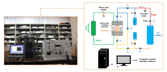 - After the confining pressure loading was completed, nitrogen was injected into both ends of the sample by gas permeation equipment to stabilize the pressure difference between the upper and lower ends at 3 MPa. Then, a permeability test was conducted, and the permeability was taken as the initial permeability before axial loading;