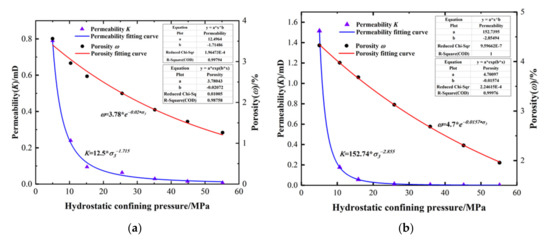 - The relationship between the permeability and hydrostatic confining pressure of dolomite is an exponential function, and that between porosity and hydrostatic confining pressure is a power function. The functional relationship is obtained by experimental fitting; the permeability and porosity of dolomite decrease with the increase in hydrostatic confining pressure;