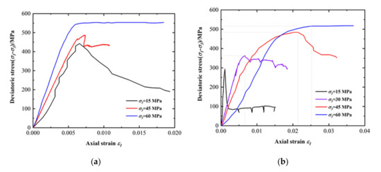- Within 60 MPa confining pressure, with the increase in confining pressure, dolomite specimens change from brittle deformation failure state to ductile deformation state, and the compressive strength increases gradually, confining pressure strengthens the compressive strength of dolomite. Furthermore, under the same confining pressure, the peak stress of conventional triaxial specimen is 10~30% higher than that of the gas–solid coupling specimen; the higher the confining pressure, the smaller the difference, and the residual stress is also the same, which indicates that the compressive strength of dolomite is weakened by gas permeation;